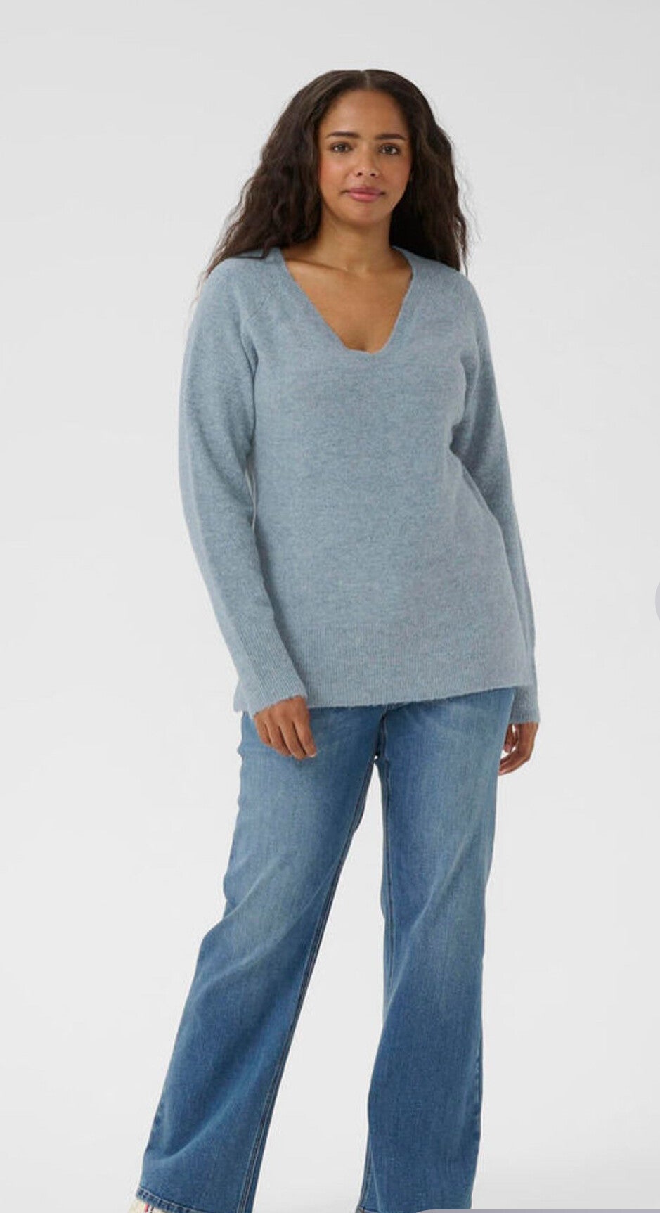 Deze pull heeft een normale pasvorm met lange mouw en v-hals