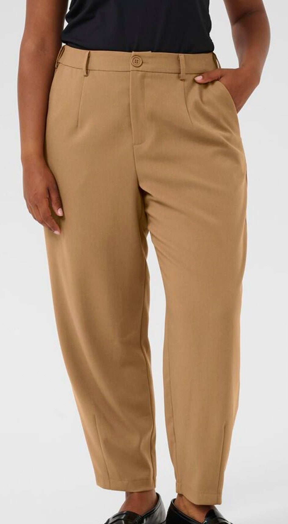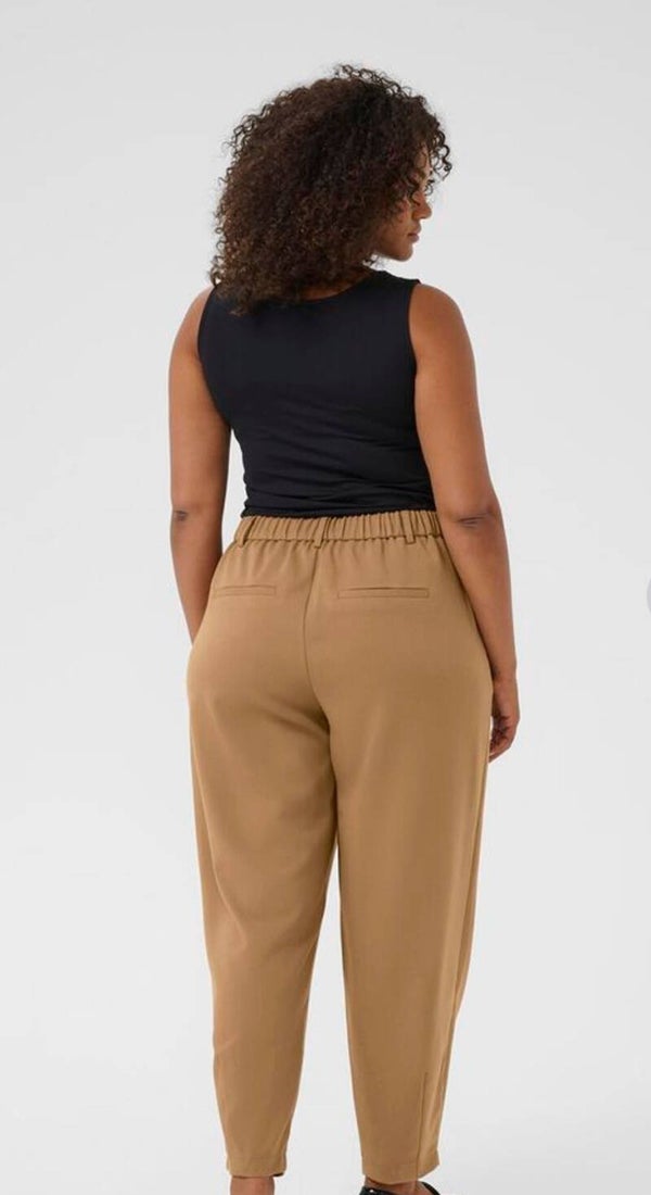 Deze broek heeft een losse pasvorm, elastische taille, komt op enkellengte met taps toelopende poot.