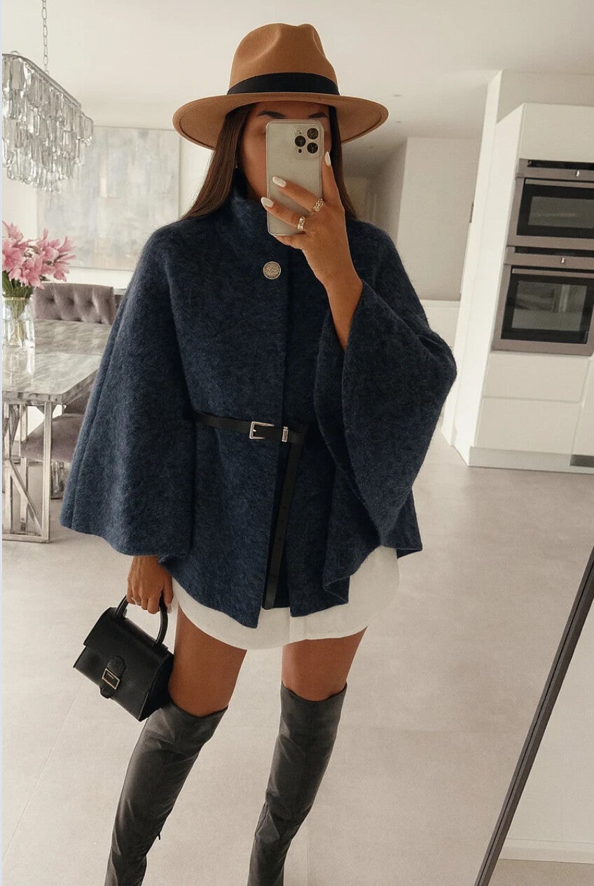 Deze poncho heeft een knoop aan de hals en in de lende kan het met een riem vastgemaakt worden.